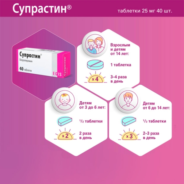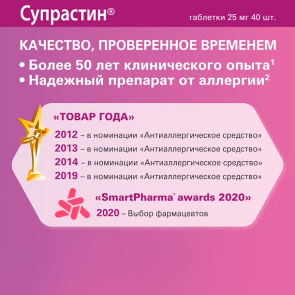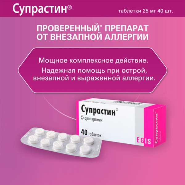 ✓ Цена на Супрастин таблетки 25мг, №40 указана на сайте и в мобильном приложении