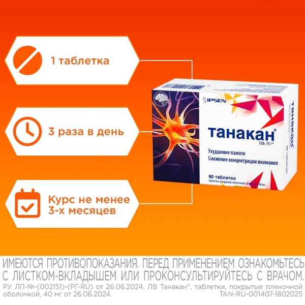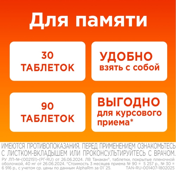 ✓ Цена на Танакан таблетки покрыт. п/о 40мг, №90 указана на сайте и в мобильном приложении