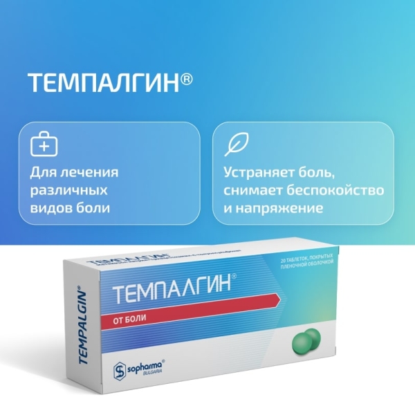 Препарат Темпалгин® показан к применению у взрослых и подростков старше 15 лет для непродолжительного симптоматического лечения от слабо до умеренно выраженных болей при следующих состояниях: головная боль, зубная боль и стоматологические процедуры, боли в мышцах (миалгии), боли по ходу нерва (невралгии), боль в суставе (артралгии).