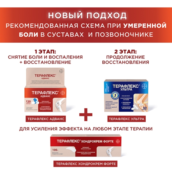 После применения Терафлекс® Адванс и лечения обострения, рекомендуется перейти на длительное применение препарата Терафлекс® (Глюкозамин + Хондроитина сульфат) для дальнейшего восстановления хрящевой ткани суставов.
