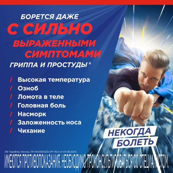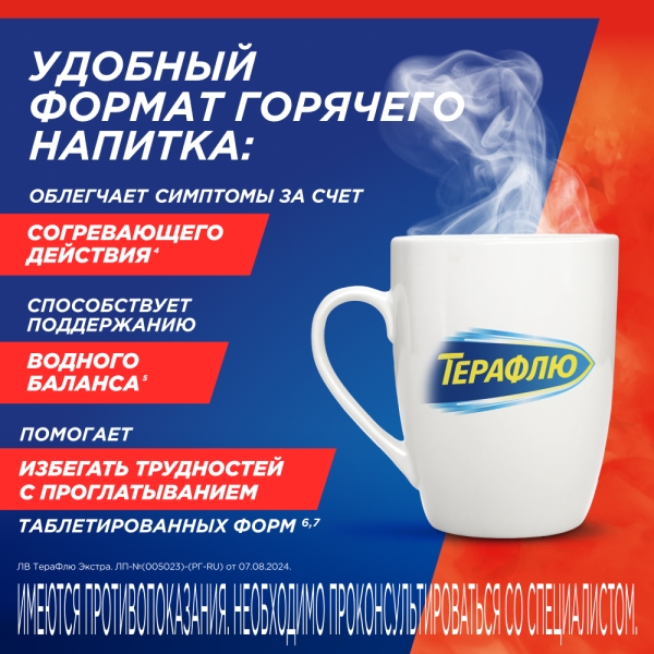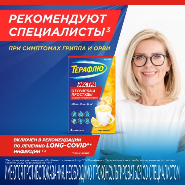 Препарат ТераФлю Экстра применяется для лечения симптомов простуды и гриппа, таких как высокая температура, сопровождающаяся ознобом, «ломотой» в теле, головной болью, заложенностью носа, чиханием и насморком у взрослых, включая пожилых, и детей 12 лет и старше.