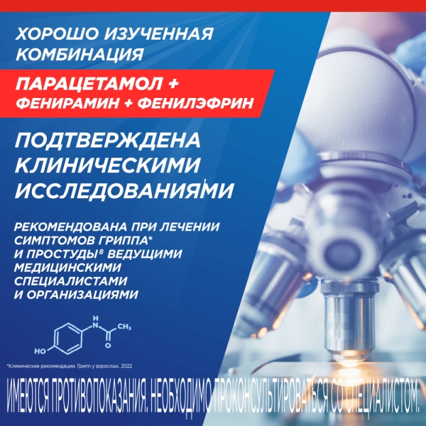 Каждый пакетик содержит 650,0 мг парацетамола, 10,0 мг фенилэфрина (в виде гидрохлорида), 20,0 мг фенирамина (в виде малеата).