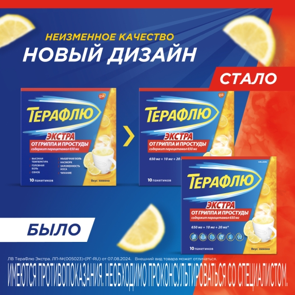 ТераФлю Экстра, 650 мг + 10 мг + 20 мг, порошок для приготовления раствора для приема внутрь со вкусом лимона