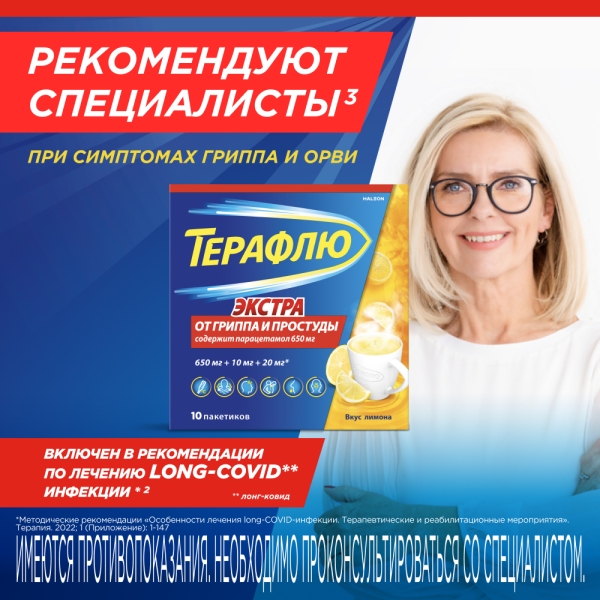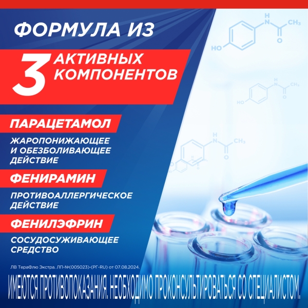 Препарат ТераФлю Экстра применяется для лечения симптомов простуды и гриппа, таких как высокая температура, сопровождающаяся ознобом, «ломотой» в теле, головной болью, заложенностью носа, чиханием и насморком у взрослых, включая пожилых, и детей 12 лет и старше.