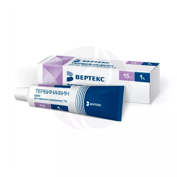 Препарат Тербинафин – ВЕРТЕКС крем для наружного применения содержит действующее вещество тербинафин (в виде гидрохлорида), которое обладает губительным действием в отношении грибов и дрожжей. Препарат относится к средствам для лечения грибковых заболеваний кожи.