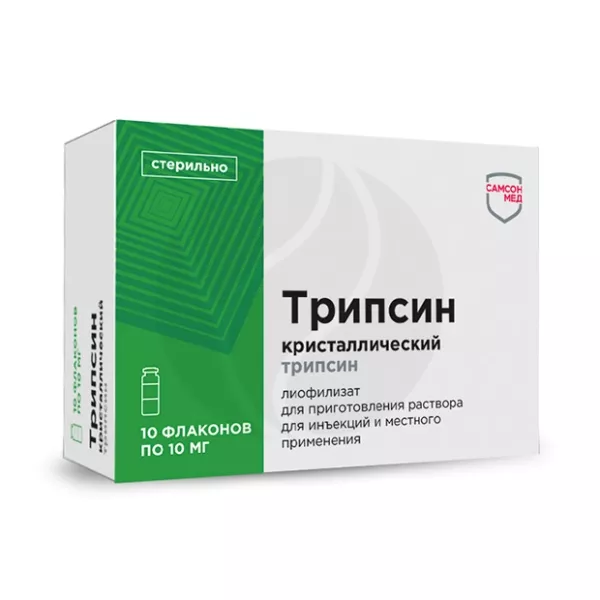 Трипсин кристаллический - ферментный препарат протеолитического действия, получаемый из поджелудочной железы крупного рогатого скота. Трипсин обладает выраженными противовоспалительными и противоотечными свойствами, способен расщеплять омертвевшие участки тканей, фибринозные образования, вязкие секреты и экссудаты. По отношению к здоровым тканям фермент неактивен и безопасен в связи с наличием в них ингибиторов трипсина (специфических и неспецифических). Не влияет на систему гемостаза.