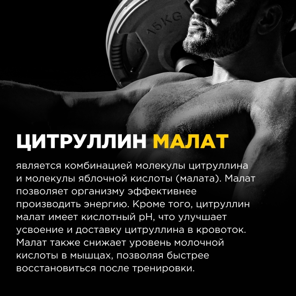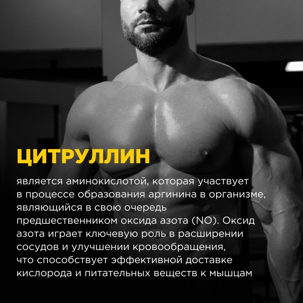 L-Цитруллин малат, подсластитель (сукралоза), ароматизатор натуральный («Цитрусовый микс»), краситель натуральный (Е172), загустители (ксантановая камедь, гуаровая камедь).
