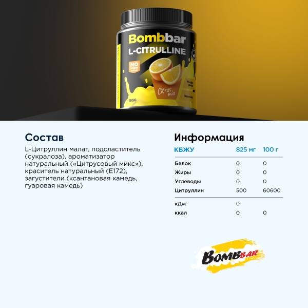 ✓ Цена на Bombbar L-цитруллин со вкусом цитрусовый микс, 165г указана на сайте и в мобильном приложении