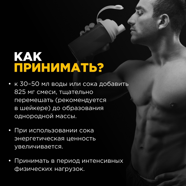 Взрослым к 30-50 мл воды или сока добавить 825 мг смеси (1/7 мерной ложки, перемешать (рекомендуется в шейкере) до образования однородной массы. При использовании сока энергетическая ценность увеличивается. Использовать в дополнение к основному рациону, между приемами пищи.
