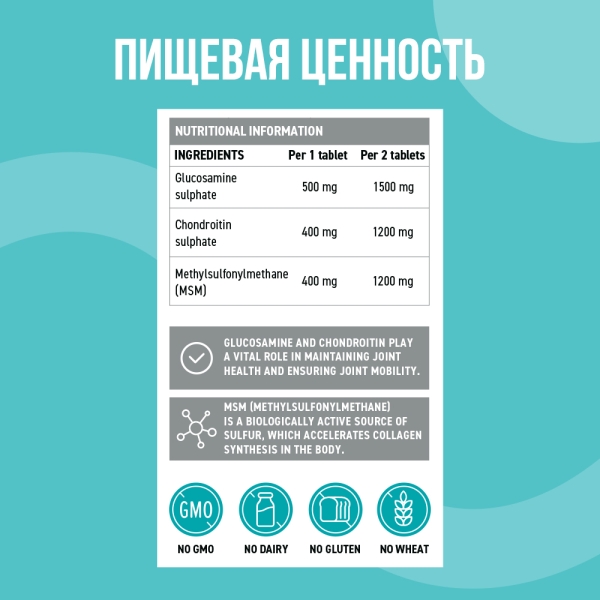 Глюкозамин сульфат 2KCl (из ракообразных), хондроитин сульфат натрия, метилсульфонилметан, агент антислеживающий (магниевые соли жирных кислот), агент антислеживающий (диоксид кремния).