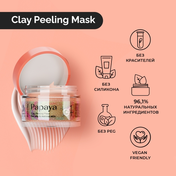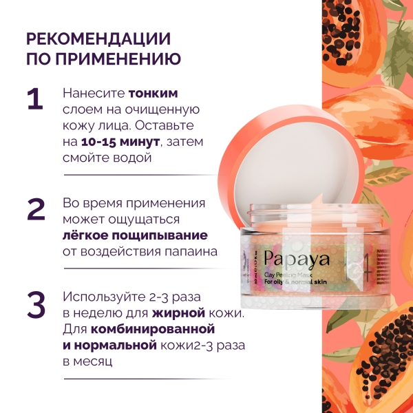 Пилинг-маска с папайей для комбинированной/склонной к жирности и нормальной кожи. Улучшает текстуру кожи. Способствует обновлению клеток. Делает кожу матовой. Впитывает загрязнения, очищает.