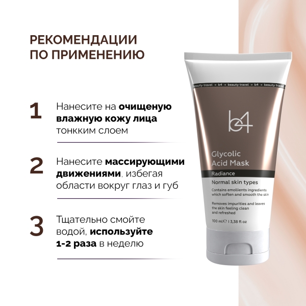 ✓ Подробная инструкция по применению b4 Radiance маска для лица с гликолевой кислотой, 100мл