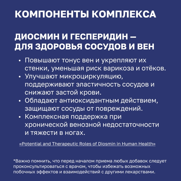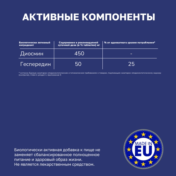 Диосмин, микрокристаллическая целлюлоза (Е460) – носитель, гесперидин, мальтодекстрин, гидроксипропилметилцеллюлоза (Е464) – носитель, карбоксиметилкрахмал натрия – носитель, стеарат магния (Е470b) – эмульгатор, повидон К30 (Е1201) - стабилизатор, кукурузный крахмал, глицерилтриацетат (Е1518) – агент влагоудерживающий, красители: карбонат кальция (Е170), диоксид железа красный (Е172), диоксид железа желтый (Е172), оксид железа черный (Е172).