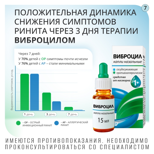 Виброцил не следует применять непрерывно на протяжении более 7 дней без консультации с врачом. Длительное или чрезмерное применение препарата может вызвать тахифилаксию и эффект "рикошета", связанный с повторным развитием заложенности носа (медикаментозный ринит), привести к развитию системного сосудосуживающего действия.