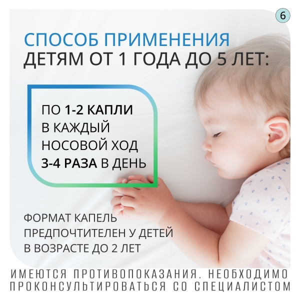 Детям в возрасте от 1 года до 6 лет (под наблюдением взрослых): по 1-2 капли в каждый носовой ход 3-4 раза в день.