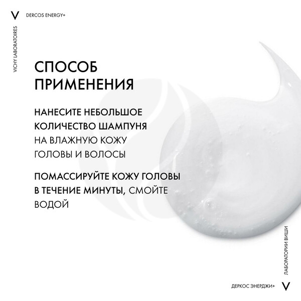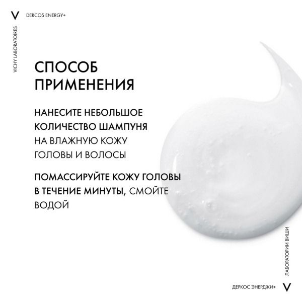 Применять совместно с использованием Ампул от выпадения волос Dercos с Аминексилом®, а также самостоятельно для мытья нормальных волос в качестве профилактического средства. Нанести массажными движениями на влажные волосы, оставить на 1 минуту, затем тщательно смыть. Не содержит мыла, парабенов, подходит для частого использования, pH-нейтральный.