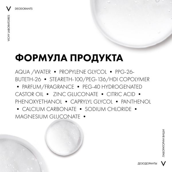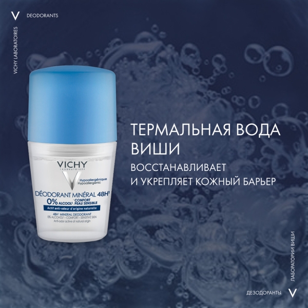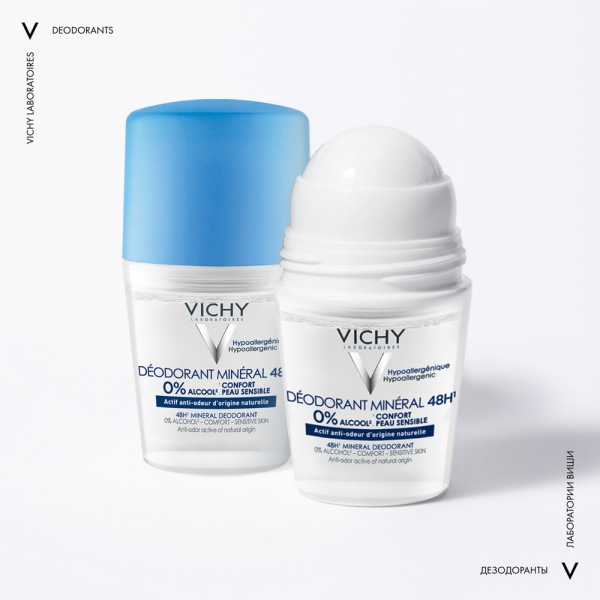 Новый дезодорант Vichy без солей алюминия содержит минерализирующую воду Vichy, представляющую собой настоящий коктейль важных для кожи минералов. Дезодорант на водной основе обеспечивает прозрачное нанесение без пятен на одежде. Дарит ощущение свежести, имеет приятный аромат, сочетающий цветочные и пудровые ноты.