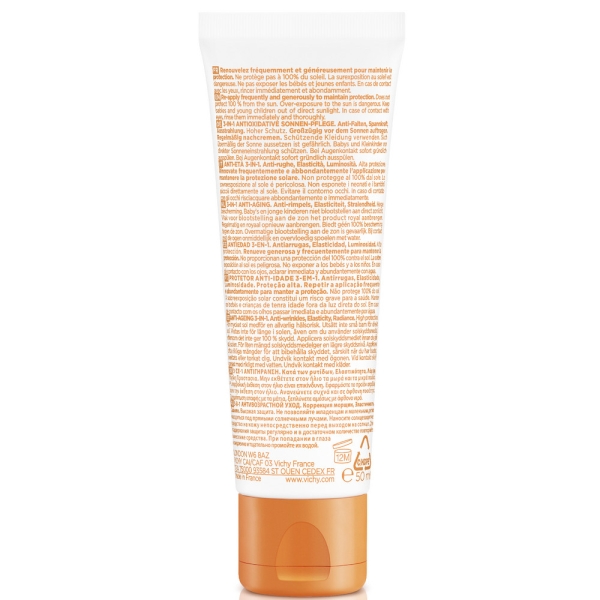 Антивозрастной солнцезащитный уход 3 в 1 с антиоксидантами SPF 50. Солнцезащитный уход, который не только предупреждает, но и корректирует существующие признаки фотостарения. Благодаря формуле с комплексом антиоксидантов и фильтрами широкого спектра SPF50 / PPD 20,9, антивозрастной крем-уход 3 в 1 борется с признаками фотостарения: морщинами, потерей эластичности, пигментными пятнами и отсутствием сияния кожи. Вулканическая термальная вода VICHY в составе обладает восстанавливающими и укрепляющими свойствами, стимулирует защитные функции кожи.