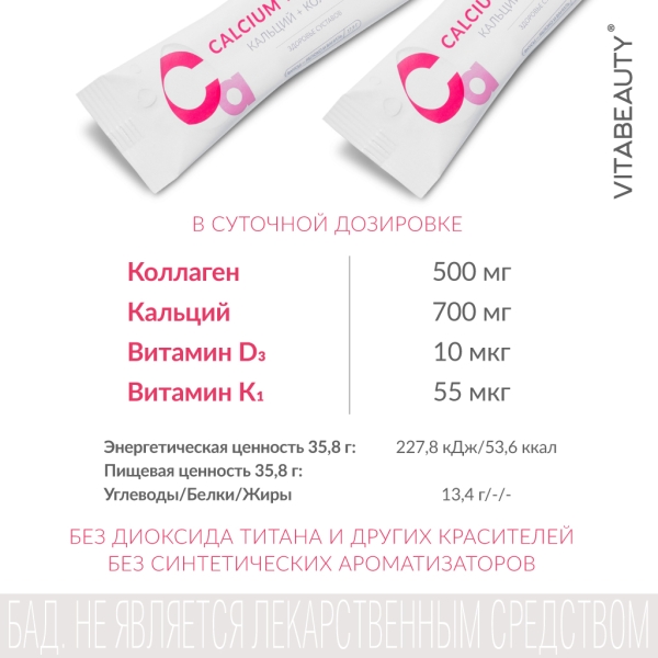 Вода очищенная; патока крахмальная; кальция лактат; кальция фосфат; желатин; коллаген гидролизованный; носитель: глицерин; ароматизатор натуральный ; регулятор кислотности: кислота лимонная; носитель: агар; консервант: бензоат натрия; носитель: ксантановая камедь; холекальциферол 100 МЕ/мг *; подсластитель: сукралоза; фитоменадион 5 % (гуммиарабик, сахароза, фитоменадион).