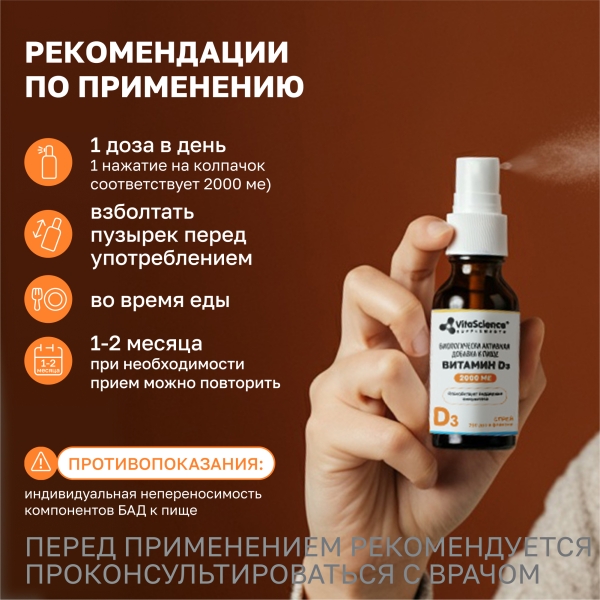 Взболтать пузырек перед употреблением, по 1 дозе (доза – 1 нажатие на колпачок дозатора соответствует 2000 МЕ) в день во время еды.