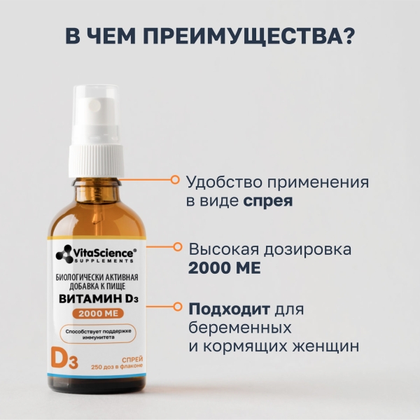 Продукт содержит: витамина Д3 в одной дозе (доза – 1 нажатие на колпачок дозатора соответствует 2000 МЕ – не более 50 мкг* соответственно.