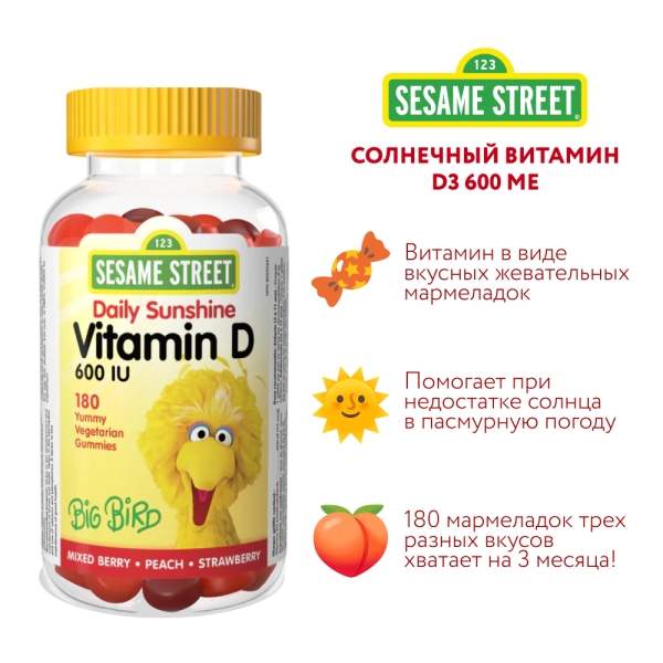 ✓ Купить Sesame Street Витамин Д3 таблетки жевательные мармеладные ягодная смесь, персик, клубника 600МЕ, №180 можно на сайте, в мобильном приложении и в аптеках Вита
