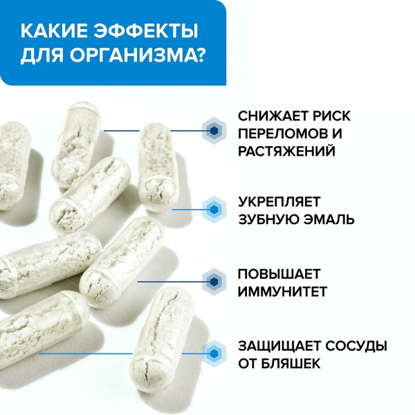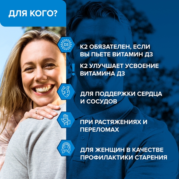 Совместный приём витаминов Д3 и K2 способствует сохранению оптимального уровня кальция в организме, ускоренному восстановлению костной ткани после переломов и снижению риска развития остеопороза. Также поддерживает работу пищеварительной системы, улучшая усвоение кальция в кишечнике, замедляет процессы старения организма и улучшает состояние кожи. Комплекс может оказывать благоприятное влияние на общее самочувствие, способствуя повышению жизненного тонуса и снижению утомляемости. Витамин D3 участвует в выработке серотонина, отвечающего за настроение и эмоциональное состояние, что особенно важно при стрессах и в периоды пониженной солнечной активности. Регулярный приём способствует поддержанию работоспособности, концентрации и внутреннего баланса.
