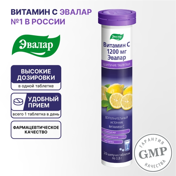 ✓ Цена на Эвалар Витамин С таблетки шипучие 1200мг, №20 указана на сайте и в мобильном приложении