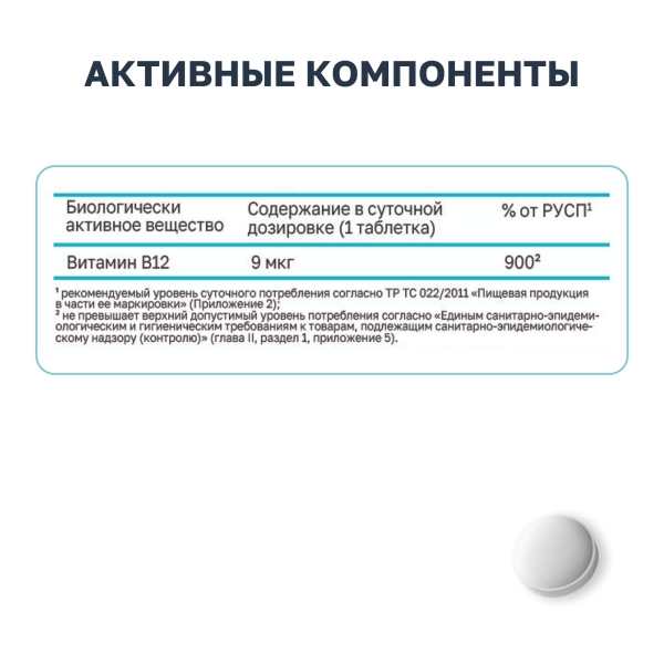 Целлюлоза микрокристаллическая (носитель), орто-фосфат кальция 2-замещенный (стабилизатор), оболочка таблетки (гидроксипропилметилцеллюлоза (загуститель), полиэтиленгликоль (стабилизатор), этилцеллюлоза (наполнитель), тальк (агент антислеживающий)), магниевая соль стеариновой кислоты (агент антислеживающий), кукурузный крахмал, диоксид кремния аморфный (агент антислеживающий), кроскарамеллоза (стабилизатор), витамин В12 (цианокобаламин).