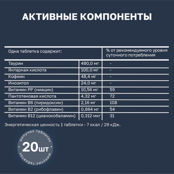 Энергетическая ценность 1 таблетки - 7 ккал / 29 кДж