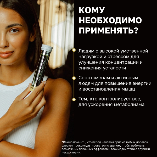 Дополнительный источник витаминов В2, В6, В12, РР, пантотеновой кислоты, а также содержит янтарную кислоту, аминокислоту таурин, кофеин, экстракт гуараны, инозитол.