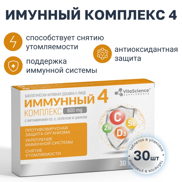 ✓ Цена на Vitascience Иммунный комплекс 4 с витаминами D3, С, Se,Zn таблетки, №30 указана на сайте и в мобильном приложении
