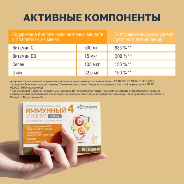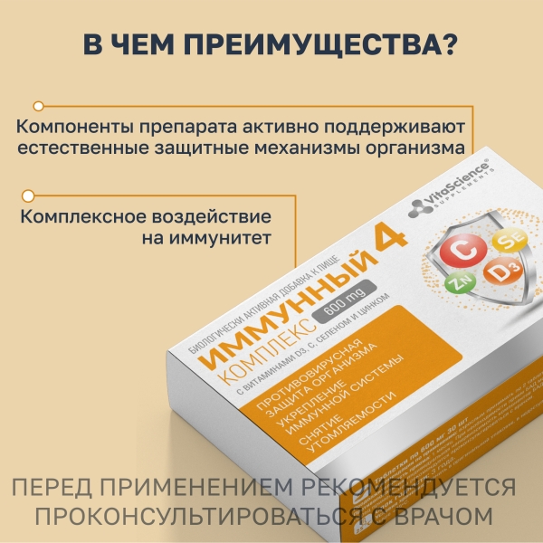 ✓ Купить Vitascience Иммунный комплекс 4 с витаминами D3, С, Se,Zn таблетки, №30 можно на сайте, в мобильном приложении и в аптеках Вита