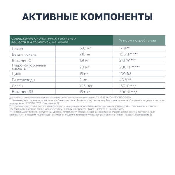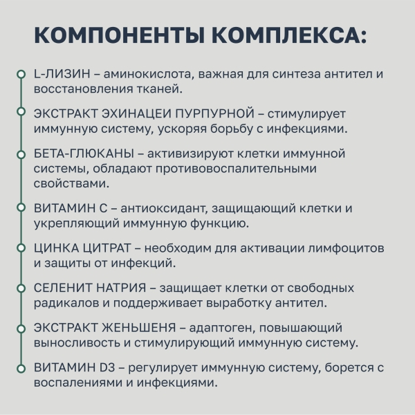 L-лизин, микрокристаллическая целлюлоза (носитель), эхинацеи пурпурной травы экстракт, бета - глюканы из дрожжей, аскорбиновая кислота (витамин С), цинка цитрат, селенит натрия, стеарат кальция (агент антислеживающий), женьшеня корней экстракт, диоксид кремния аморфный (агент антислеживающий), витамин Д3 (холекальциферол).