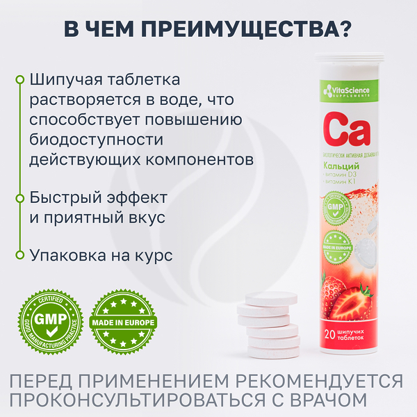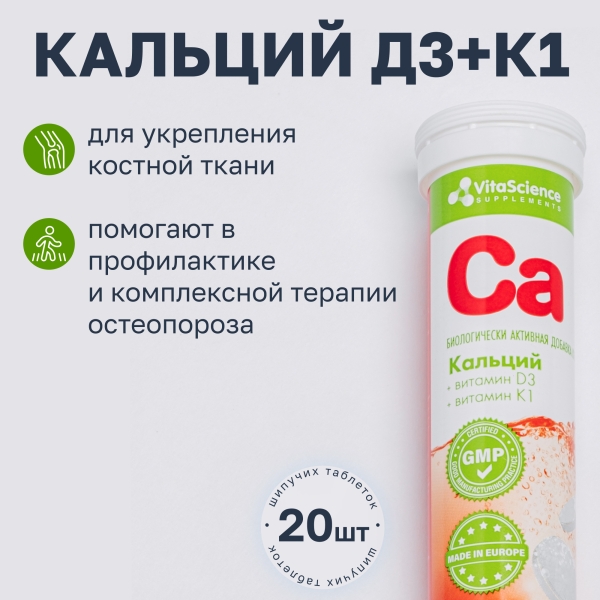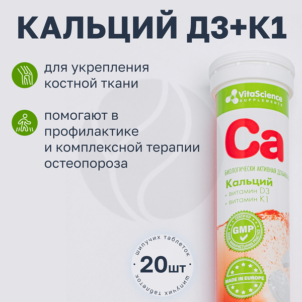 ✓ Купить Vitascience Шипучие витамины Кальций+витамин Д3+витамин К1 таблетки шипучие, №20 можно на сайте, в мобильном приложении и в аптеках Вита
