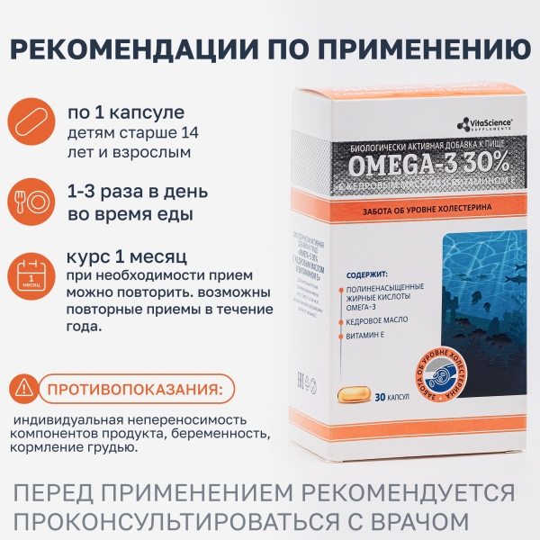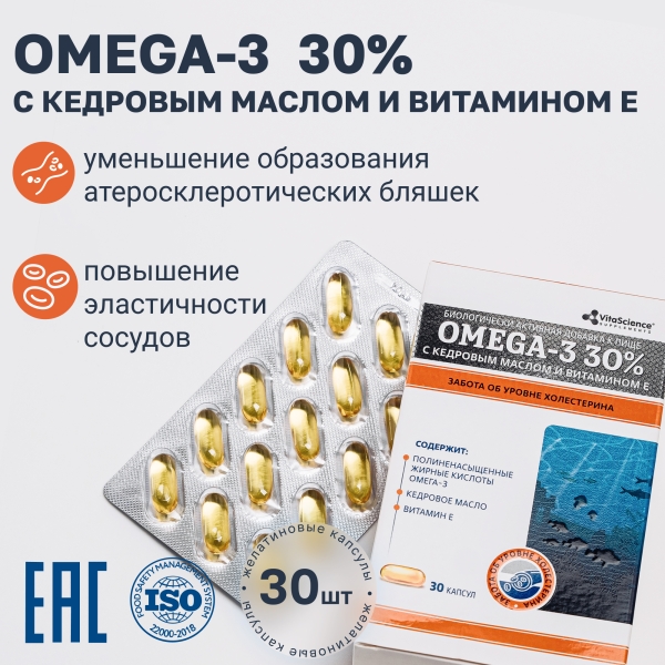 ✓ Цена на Vitascience Омега -3 30% с кедровым маслом и витамином Е, №30 указана на сайте и в мобильном приложении
