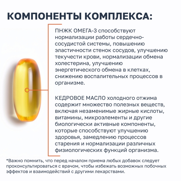 Жир океанических рыб, оболочка( желатин, глицерин (загуститель), вода), кедровое масло, витамин Е, смесь токоферолов (антиокислитель).