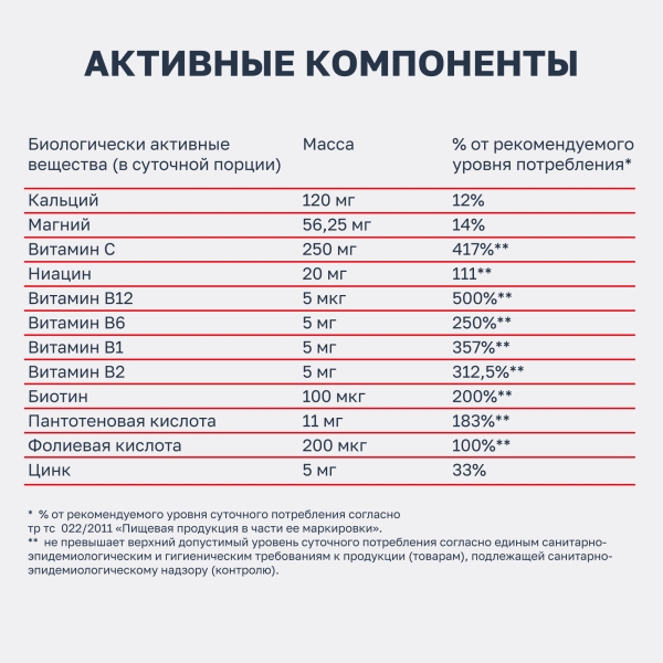 Регуляторы кислотности: лимонная кислота, натрия гидрокарбонат; сорбит (подсластитель), карбонат кальция, витамин С (L-аскорбиновая кислота), карбонат магний, мальтодекстрин, В-комплекс (никотинамид, пантотеновая кислота, Витамин В6 (пиридоксина гидрохлорид), Витамин В2 (рибофлавин), В1 (тиамина гидрохлорид), фолиевая кислота, биотин, витамин В12 (цианокобаламин)), натрия цикламат (подсластитель), полиэтиленгликоль (стабилизатор), натуральный ароматизатор "Апельсин" (содержит сахар, регулятор кислотности цитрат натрия, натуральный апельсиновый ароматизатор, краситель бета-каротин, концентрат порошка свеклы), цинка оксид.