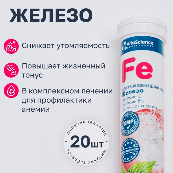 ✓ Купить Vitascience Шипучие витамины Железо+витамин С+витамин В6+фолиевая кислота таблетки шипучие, №20 можно на сайте, в мобильном приложении и в аптеках Вита