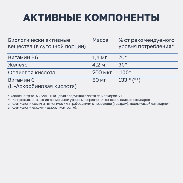 Для реализации населению в качестве биологически активной добавки к пище – источника железа, витамина С (L – аскорбиновой кислоты), витамина В6, фолиевой кислоты.
