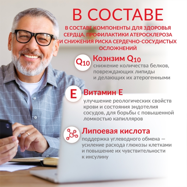 Капсула №1: мальтодекстрин; капсула (желатин; красители: диоксид титана, желтый «Cолнечный закат» FCF); убихинон (коэнзим Q10), липоевая кислота, альфа-токоферола ацетат 50 % (DL-альфа-токоферола ацетат, модифицированный крахмал, мальтодекстрин, диоксид кремния); носитель: микрокристаллическая целлюлоза; антислёживающие агенты: диоксид кремния аморфный, магниевая соль стеариновой кислоты (магния стеарат).