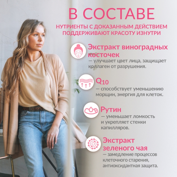 Капсула №1. Кальция карбонат, магния оксид; капсула (желатин; краситель диоксид титана); аскорбиновая кислота, цинка цитрат, альфа-токоферола ацетат 50 % (DL-альфа-токоферола ацетат, модифицированный крахмал, мальтодекстрин, диоксид кремния аморфный); носитель: микрокристаллическая целлюлоза; ниацинамид, железо электролитическое, экстракт виноградной косточки, рутин, экстракт листьев зеленого чая; антислёживающий агент: тальк; носитель: жирные кислоты (стеариновая кислота); кальция пантотенат, бета-каротин 20 % (модифицированный крахмал, кукурузный крахмал, бета-каротин, глюкозный сироп, аскорбат натрия, альфа-токоферол), убихинон (коэнзим Q10); антислёживающие агенты: магниевая соль стеариновой кислоты (магния стеарат), диоксид кремния аморфный; фитоменадион 5 % (гуммиарабик, сахароза, фитоменадион), пиридоксина гидрохлорид, тиамина гидрохлорид, рибофлавин, холекальциферол 100 МЕ/мг (модифицированный крахмал, сахароза, аскорбат натрия, среднецепочечные триглицериды, диоксид кремния, альфа-токоферол, холекальциферол), фолиевая кислота, калия йодат, натрия селенит, биотин, цианокобаламин.