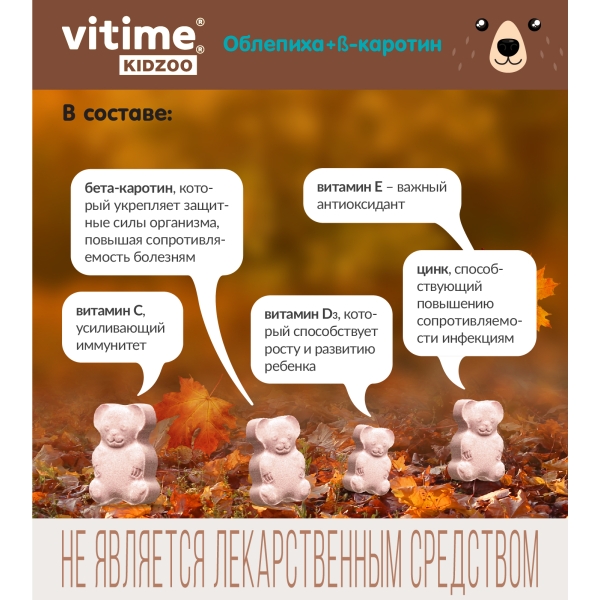 Носитель: глюкозы моногидрат; вкусоароматический компонент: экстракт плодов облепихи; носитель: поливинилпирролидон; антислёживающий агент: тальк; аскорбиновая кислота; антислёживающие агенты: диоксид кремния аморфный, магния стеарат; цинка цитрат, токоферола ацетат 50 % (альфа-токоферола ацетат, мальтодекстрин, крахмал модифицированный, диоксид кремния); носитель: стеариновая кислота; ароматизатор натуральный облепиховый (носители: мальтодекстрин, глюкозный сироп, гуммиарабик); бета-каротин 20 % (модифицированный крахмал, кукурузный крахмал, бета-каротин, глюкозный сироп, аскорбат натрия, альфа-токоферол), холекальциферол 100 МЕ/мг (модифицированный крахмал, сахароза, аскорбат натрия, среднецепочечные триглицериды, диоксид кремния, альфа-токоферол, витамин D3); краситель натуральный аннато Е160b.