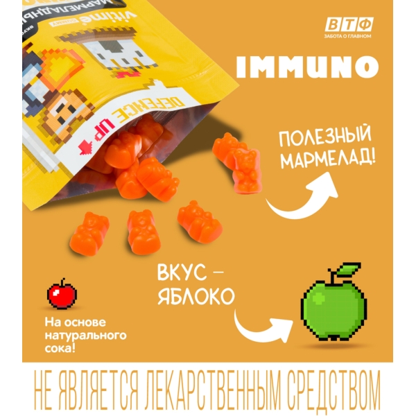 Патока крахмальная, сахар; премикс «МиксМи Иммуно» (MixMe Immuno) /носитель: мальтодекстрин; аскорбиновая кислота, цинка цитрат, токоферола ацетат; ароматизатор натуральный яблочный; бета-каротин; регулятор кислотности: лимонная кислота; ретинола ацетат, холекальциферол, натрия селенит/; желатин; концентрированный сок яблока; регулятор кислотности: лимонная кислота; комплексная пищевая добавка Capol ® (растительное масло, карнаубский воск); масло подсолнечное рафинированное.