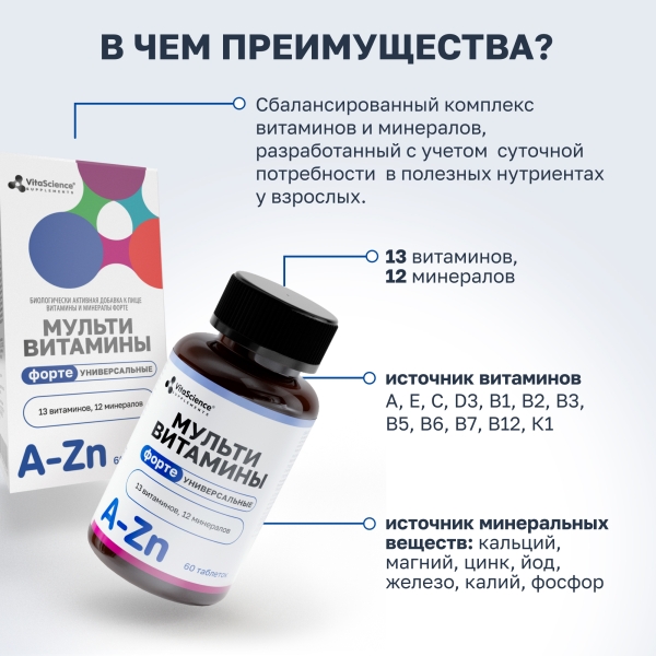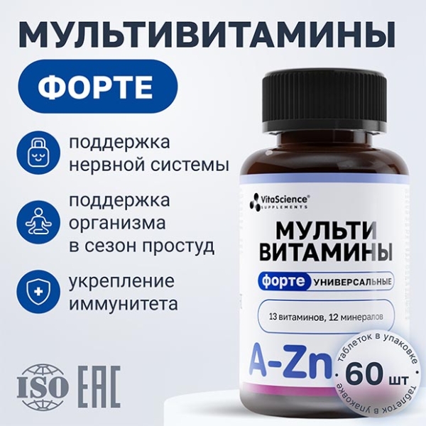 ✓ Купить Vitascience Мультивитамины универсальные Форте таблетки, №60 можно на сайте, в мобильном приложении и в аптеках Вита