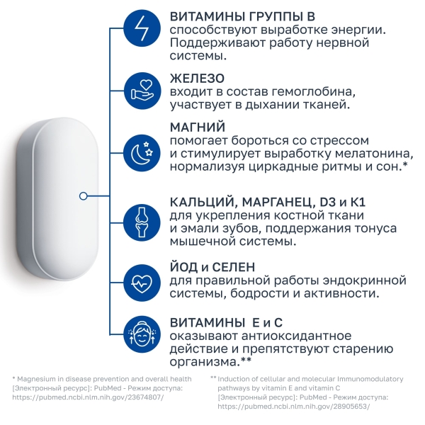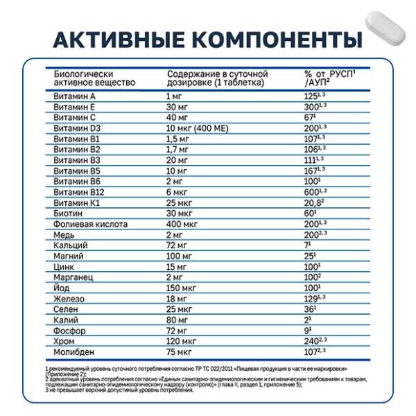 Двухосновный фосфат кальция безводный, целлюлоза микрокристаллическая (носитель), магния оксид, калия хлорид, Dl-альфа-токоферола ацетат (витамин Е), железа фумарат, L-аскорбиновая кислота (витамин С), поливинилпирролидон (стабилизатор), оболочка таблетки (гидроксипропилметилцеллюлоза (носитель), полиэтиленгликоль (стабилизатор), этилцеллюлоза (носитель), тальк (агент антислеживающий), диоксид титана (краситель)), кроскарамеллоза (стабилизатор), крахмал, обработанный щелочью (натрия гликолят крахмала) (стабилизатор), никотинамид (витамин В3), кукурузный крахмал, магния стеарат (стабилизатор), цинка оксид, ретинил ацетат (витамин А), D-пантотенат кальция (витамин В5), тальк (агент антислеживающий), диоксид кремния (агент антислеживающий), марганца сульфат моногидрат, D-биотин, пиридоксина гидрохлорид (витамин В6), меди оксид, эфир лютеина из цветков бархатцев прямостоячих, тиамина мононитрат (витамин В1), рибофлавин (витамин В2), бета-каротин (витамин А), холекальциферол (витамин D3), цианокобаламин (витамин В12), фитоменадион (Витамин К1), хрома хлорид гексагидрат, фолиевая кислота (витамин В9), калия йодид, натрия молибдат дигидрат, натрия селенат.
