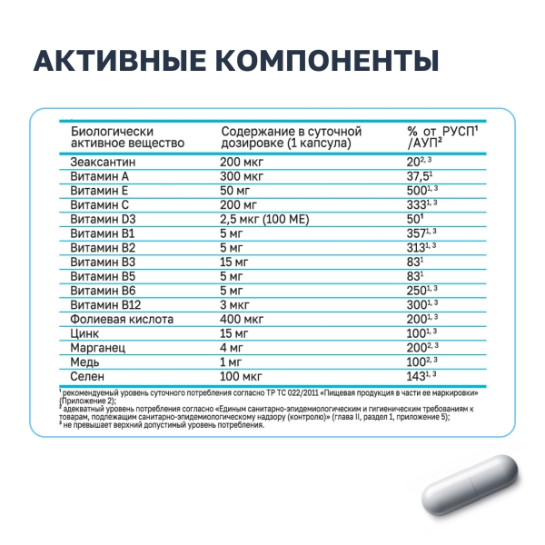 L-аскорбиновая кислота (витамин С), целлюлоза микрокристаллическая (носитель), альфа-токоферола ацетат (витамин E), оболочка капсулы (желатин, красители: диоксид титана, желтый «солнечный закат» FCF, кармуазин, синий патентованный V), цинка оксид, никотинамид (витамин В3), марганца сульфат, D-пантотенат кальция (витамин В5), пиридоксина гидрохлорид (витамин В6), рибофлавин (витамин В2), тиамина мононитрат (витамин В1), экстракт цветков бархатцев прямостоячих, меди сульфат, магния стеарат (стабилизатор), диоксид кремния (агент антислеживающий), зеаксантин, фолиевая кислота (витамин В9), натрия селенат, холекальциферол (витамин D3), бета-каротин (витамин А), рутин, цианокобаламин (витамин В12). Содержит красители, которые могут оказывать отрицательное влияние на активность и внимание детей.