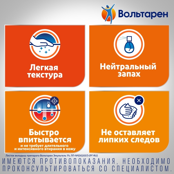 Благодаря своей водно-спиртовой основе Вольтарен Эмульгель оказывает успокаивающий и охлаждающий эффект.