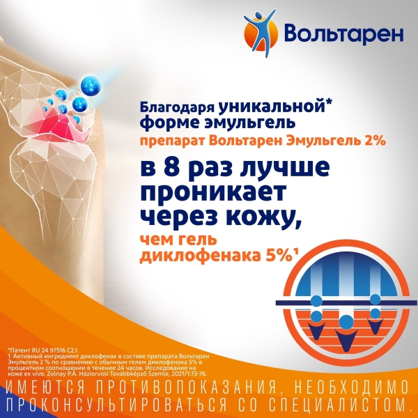 Количество диклофенака, всасывающегося через кожу, пропорционально площади обрабатываемой поверхности и зависит как от суммарной дозы наносимого препарата, так и от степени гидратации кожи. После нанесения на поверхность кожи площадью 400 см2 Вольтарен® Эмульгель®, гель для наружного применения 2% (2 нанесения в сутки), концентрация действующего вещества в плазме соответствует его концентрации при использовании 1% геля диклофенака (4 нанесения в сутки). На 7-й день относительная биодоступность препарата (отношение AUC) составляет 4,5% (для эквивалентной дозы натриевой соли диклофенака). При ношении влагопроницаемой повязки всасывание не изменялось.