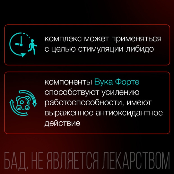 Компоненты комплекса ВУКА ФОРТЕ имеют выраженное антиоксидантное действие, усиливают работоспособность, физическую и психическую выносливость, нормализуют обмен веществ, обладают нейропротективным эффектом, защищают от атеросклероза. Комплекс может применяться с целью поддержания мышечного роста, увеличения физической силы, стимуляции и усиления либидо, поддержания синтеза тестостерона, а также для защиты организма от любых негативных воздействий при вирусных инфекциях, усталости, тяжелых физических нагрузках.
